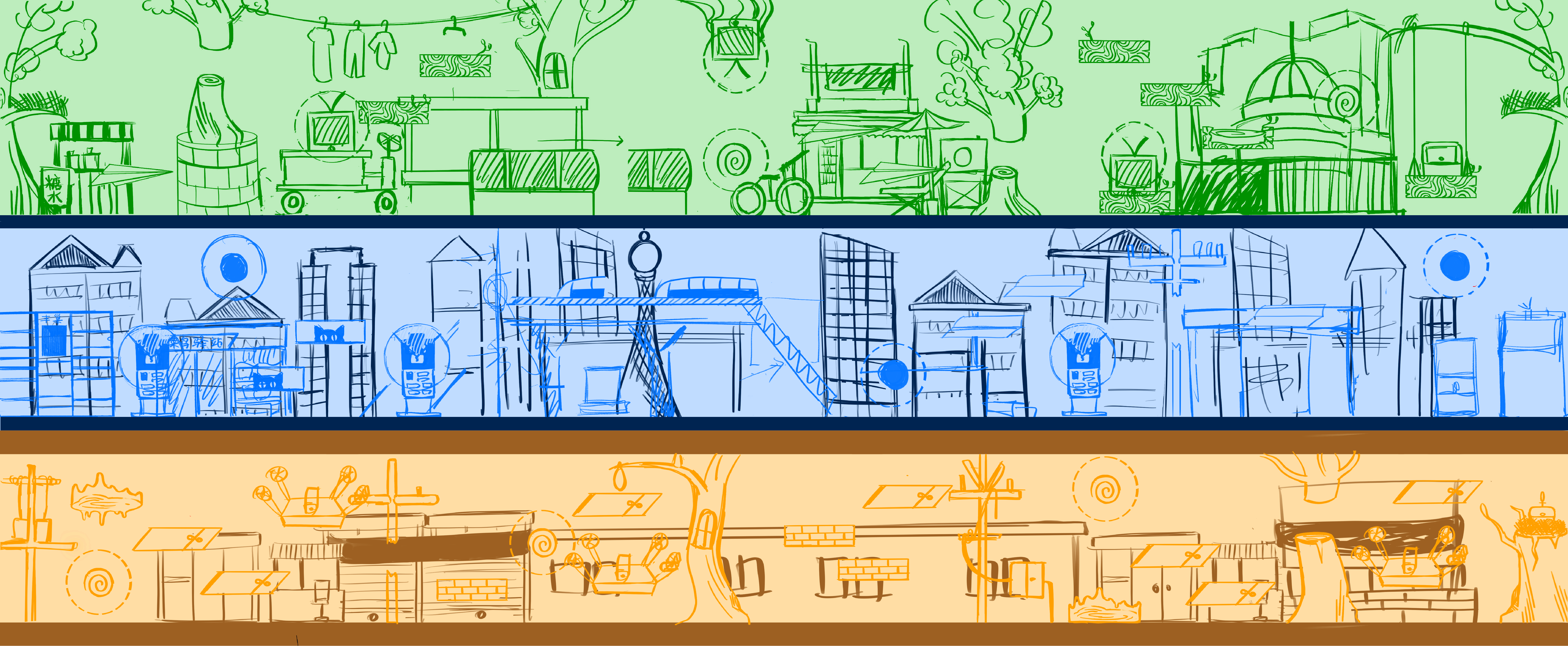 However, despite all of these united traits, each level of map represents a specific phrase of the sparrow’s life, shaping the difference in cityscape scene and characters’ features.