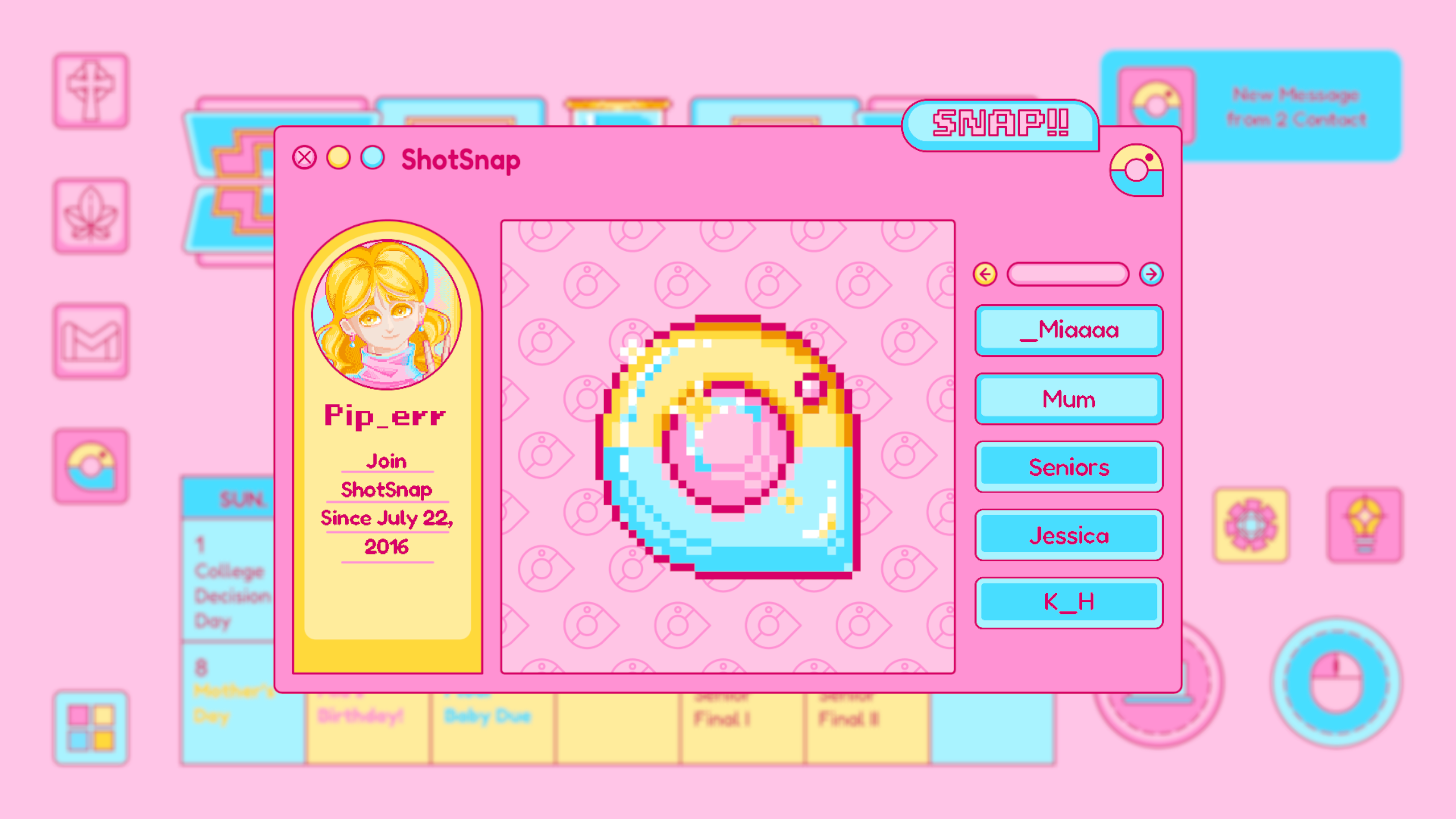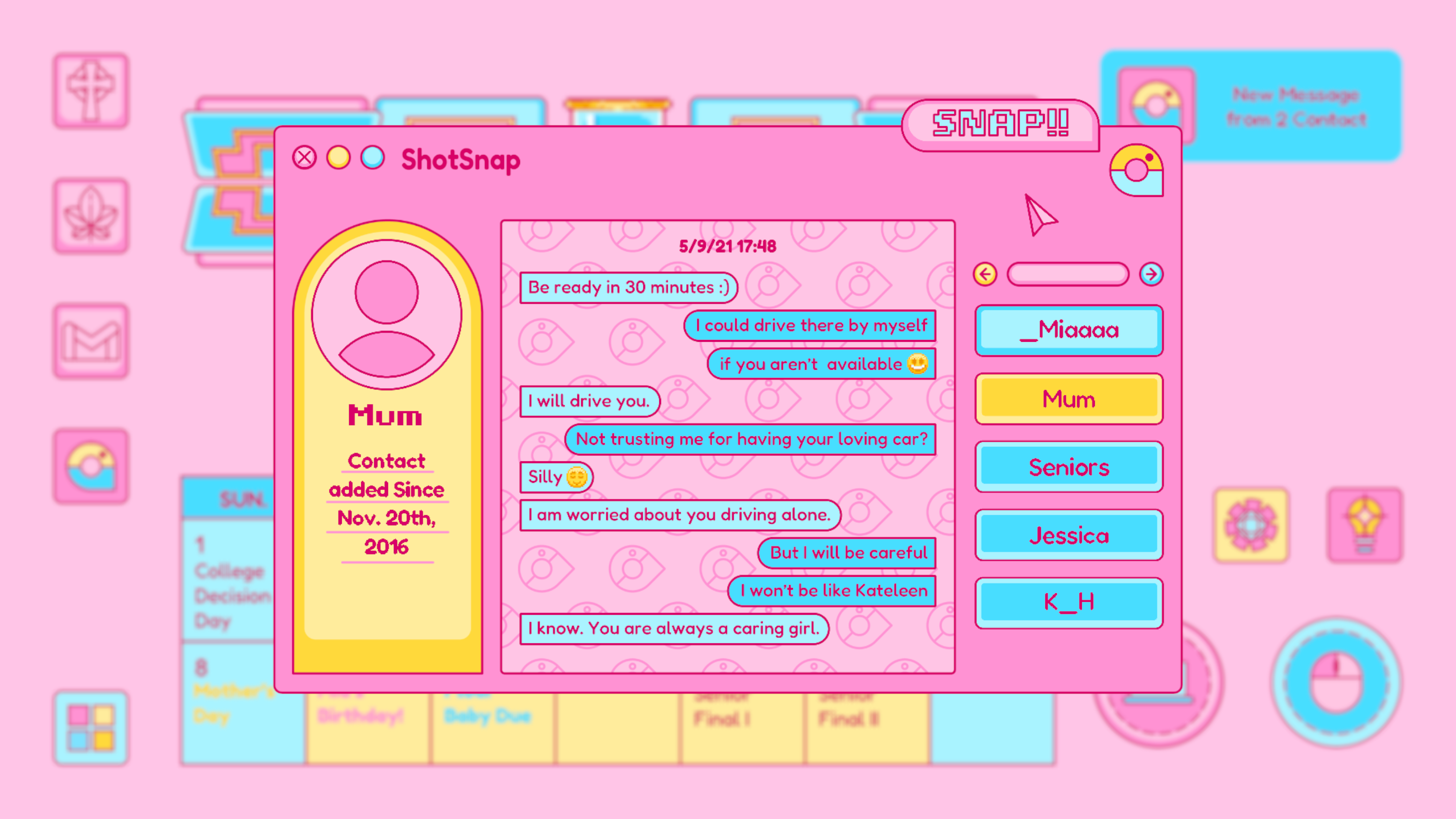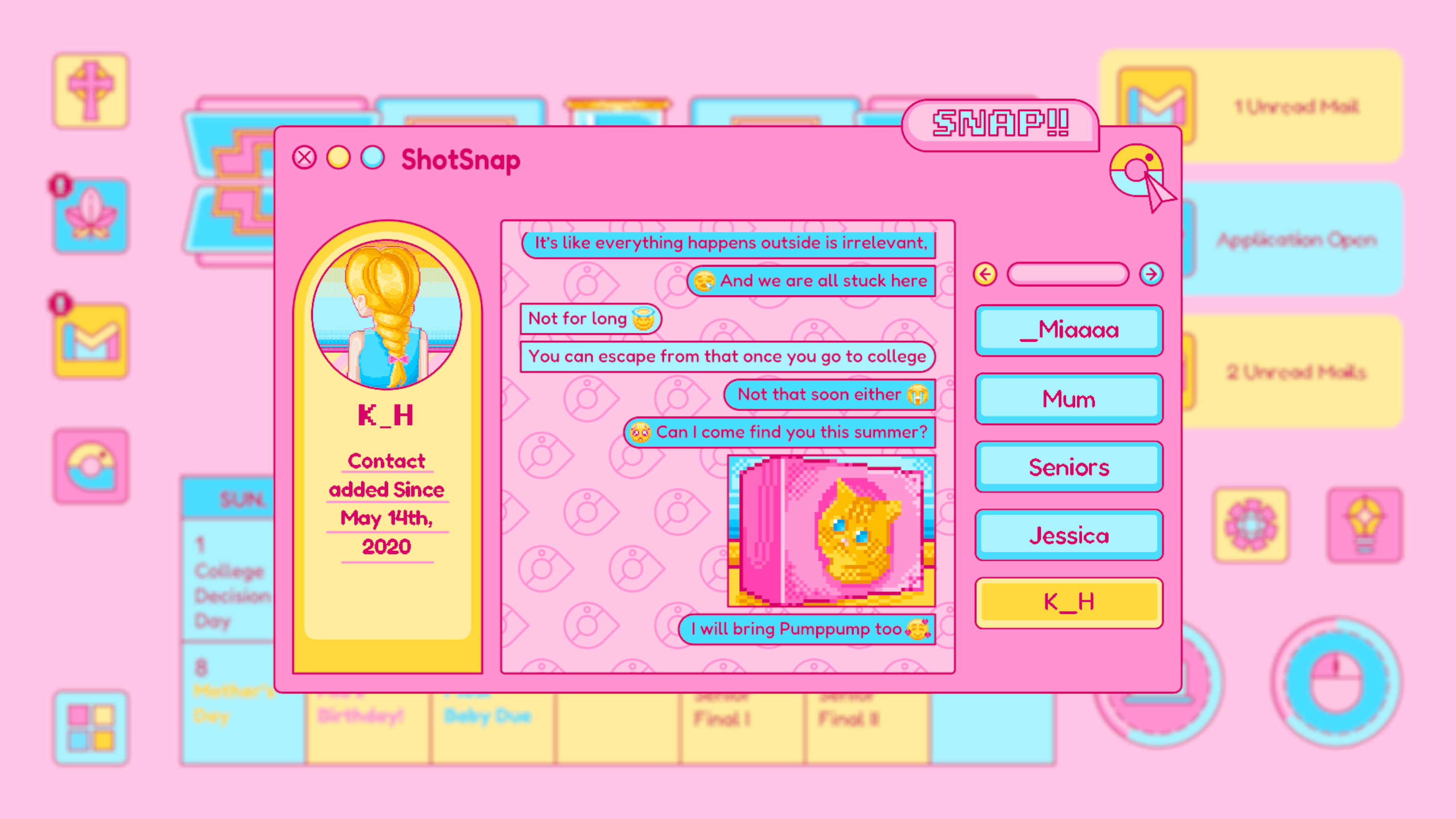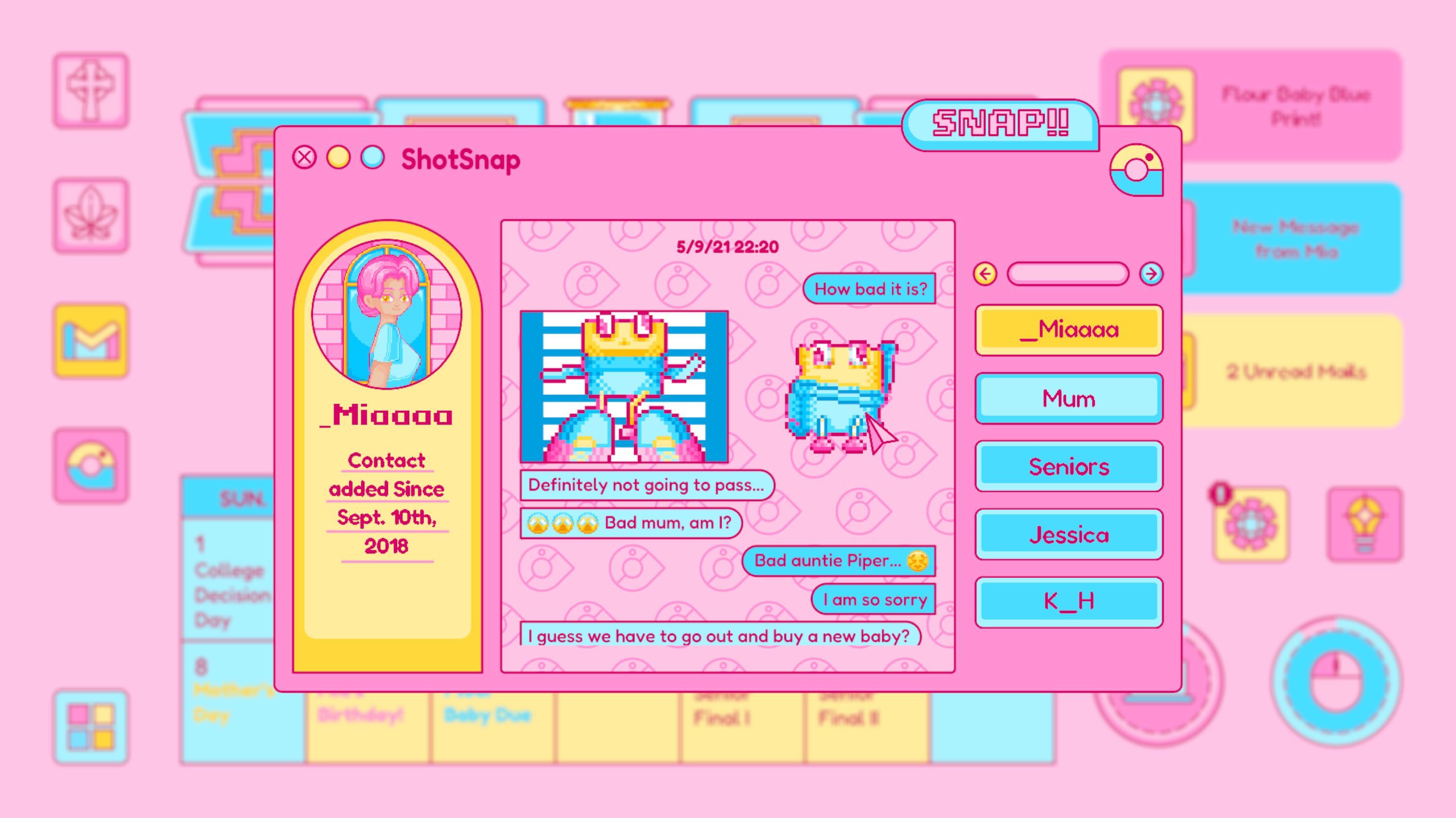 ShotSnap is designed based on the real life Instagram and Snapchat, which is where Piper connects with all of her contacts: friends, families, classmates and even teachers with close relationships. It is mostly where the player explores all the relationships of Piper, or serves as the supplemented information of the story. It is the first app to be open, no previous unlock needed.