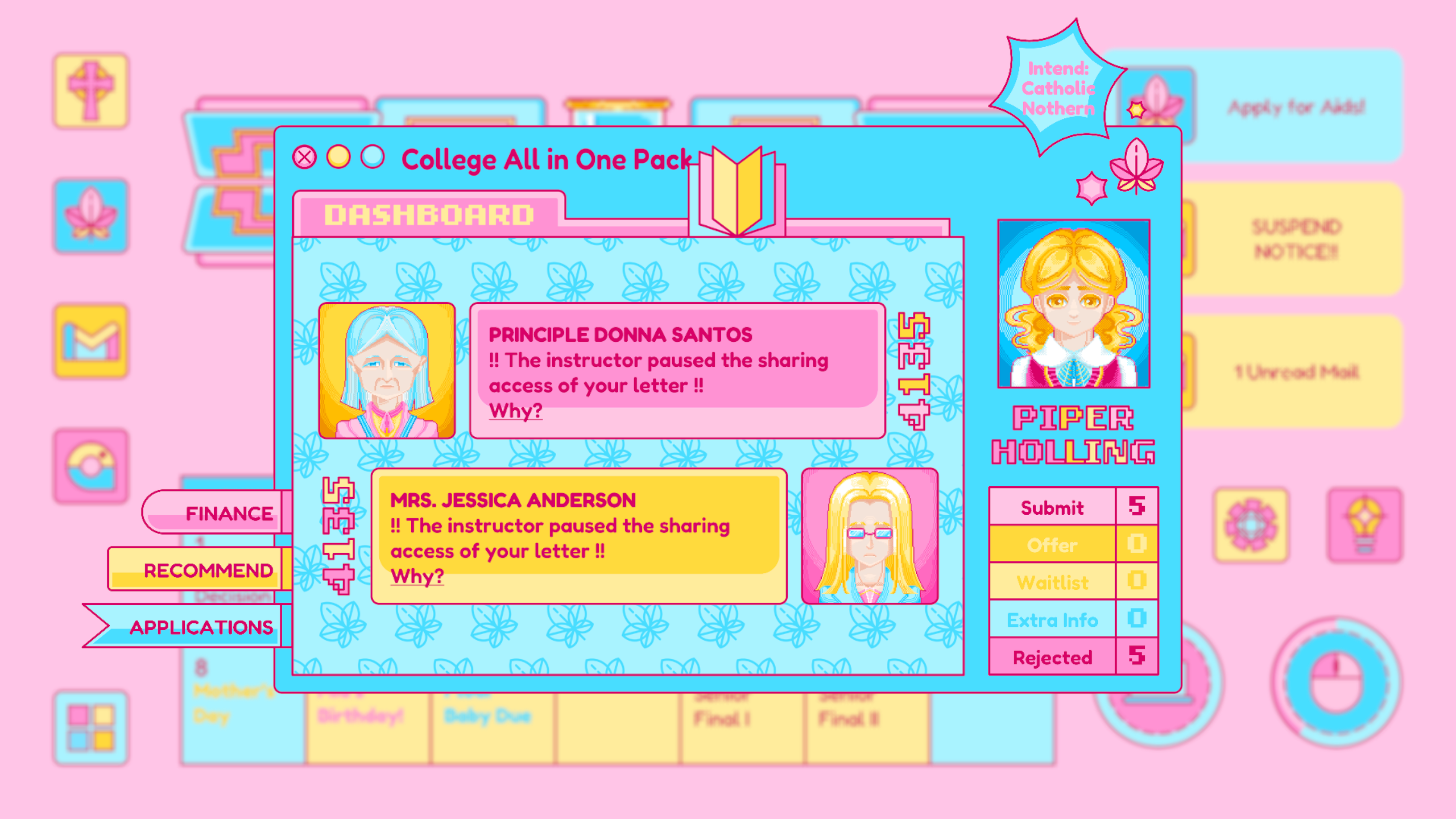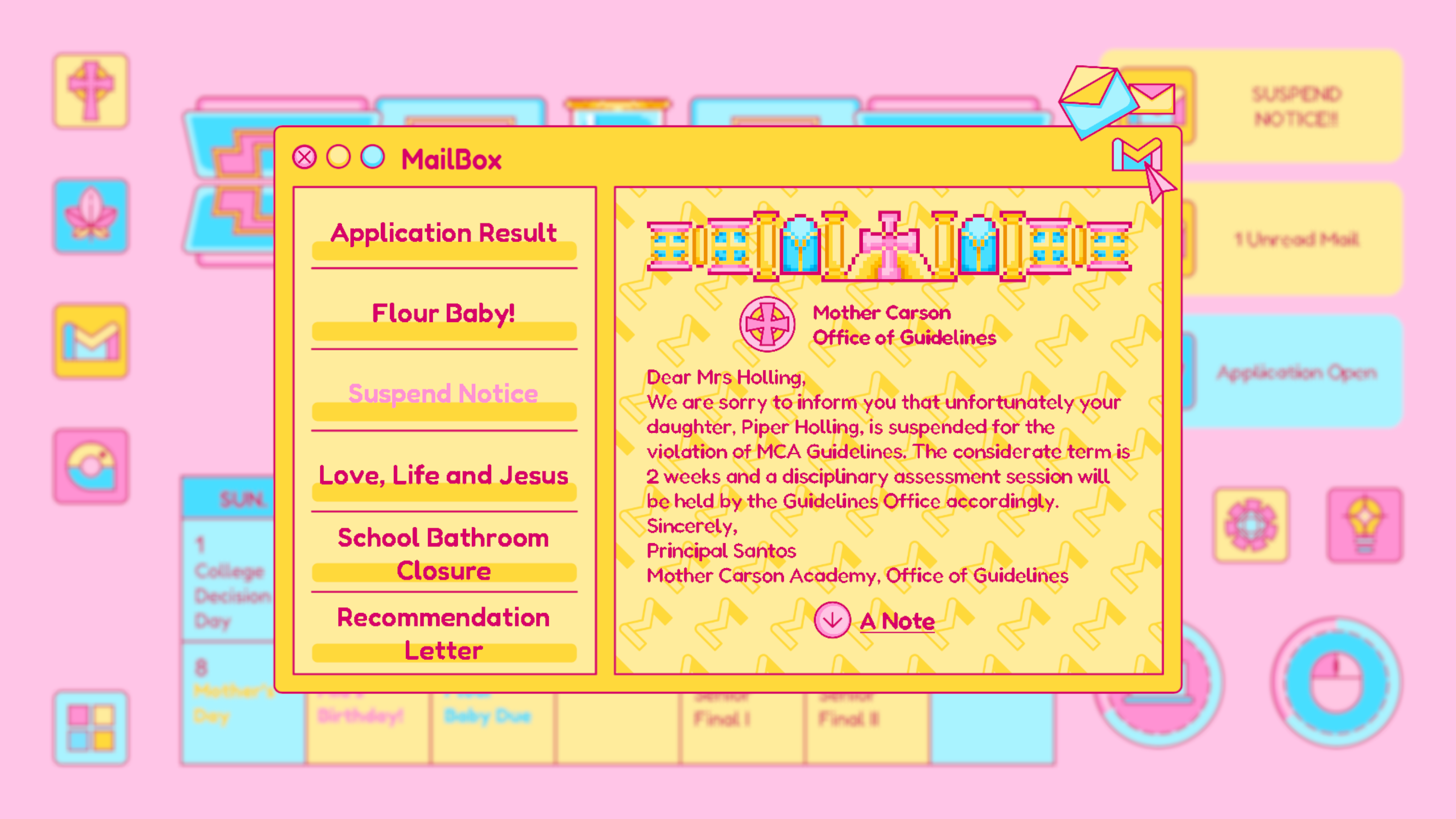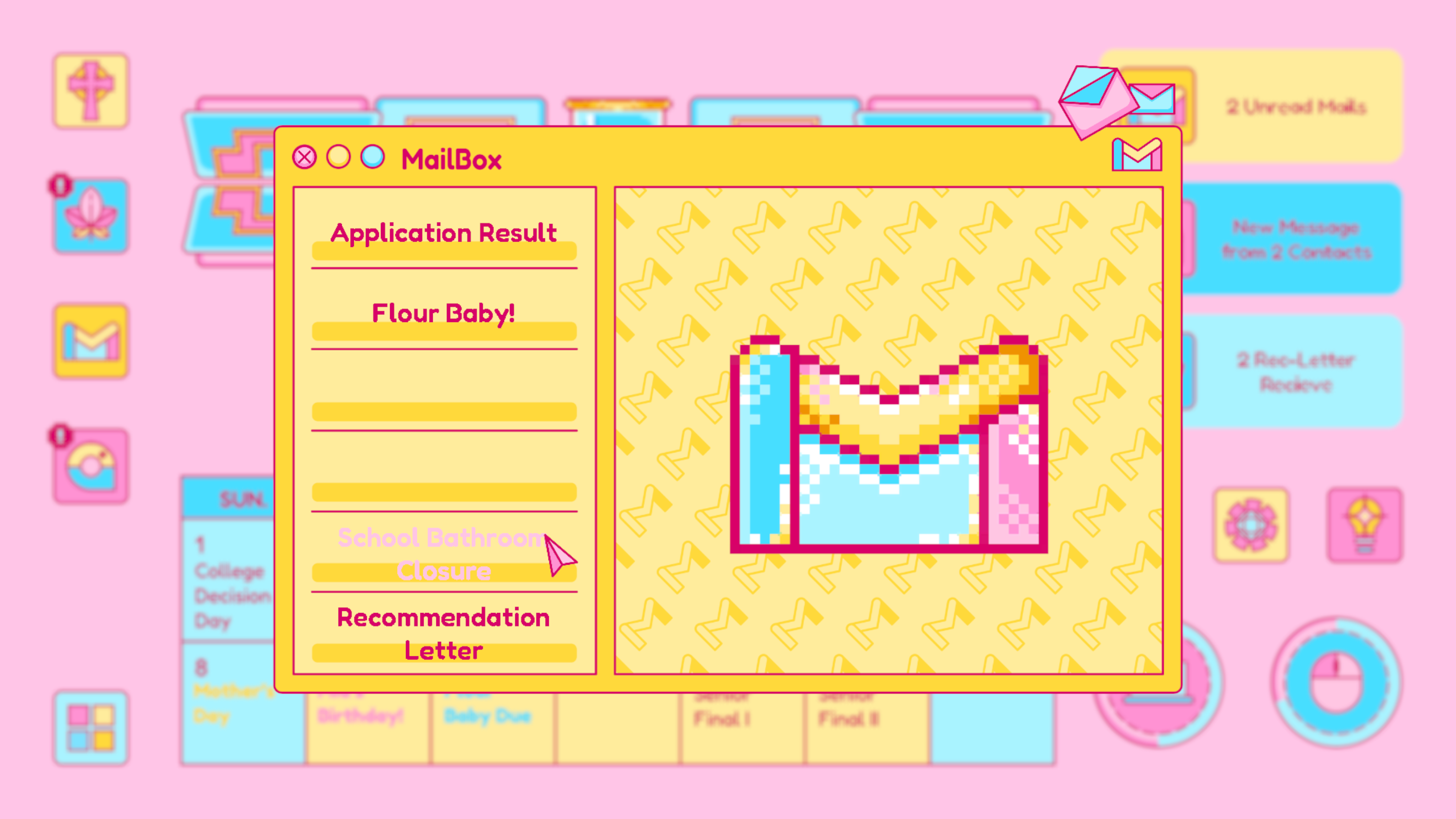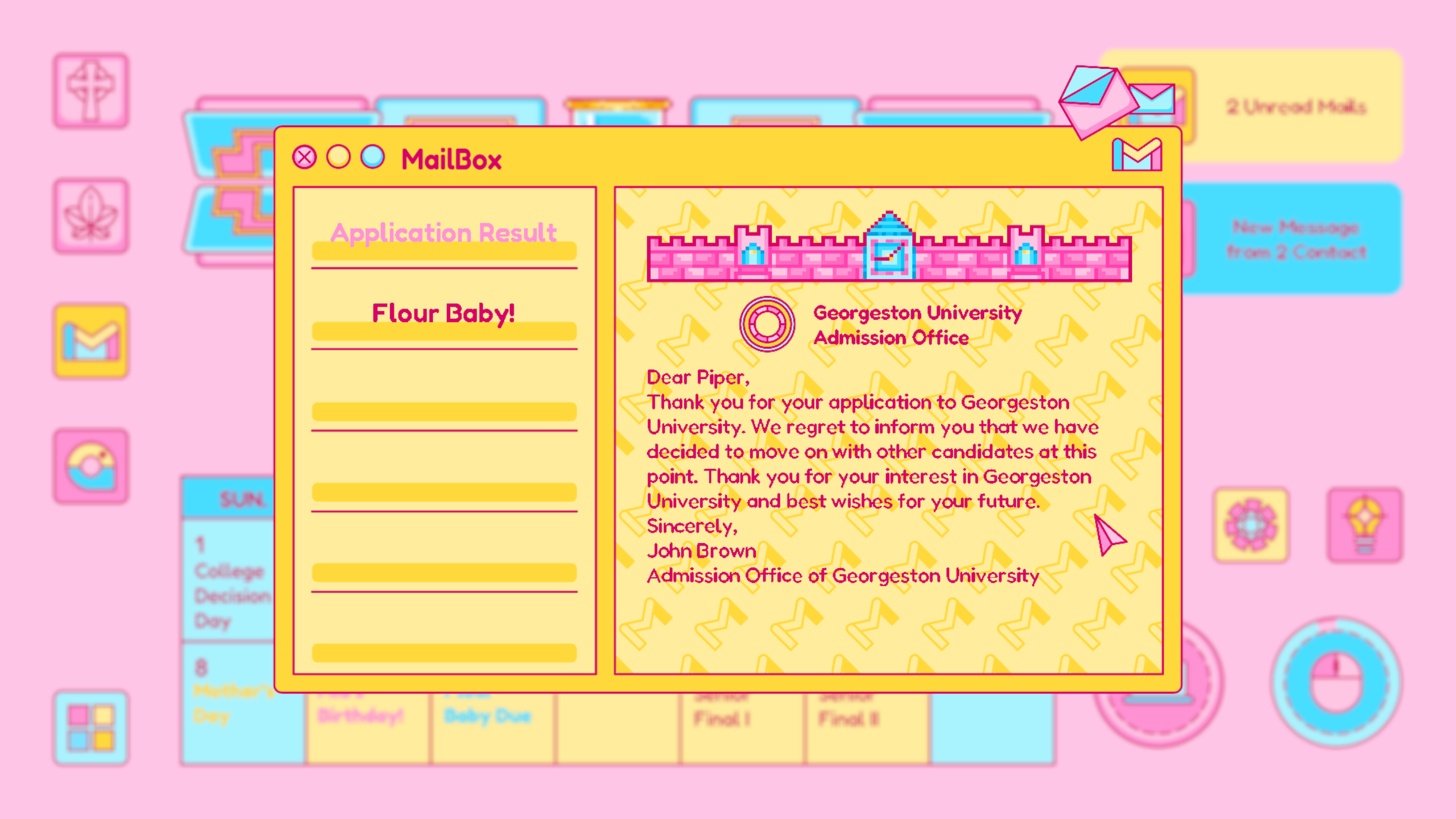Mail is designed based on any real life email app, which is where Piper receives important and formal notice from colleges, schools, classes and instructors. The update of the mail usually signifies an important notice to change Piper’s current status. For example, the rejected letter from her dream school.