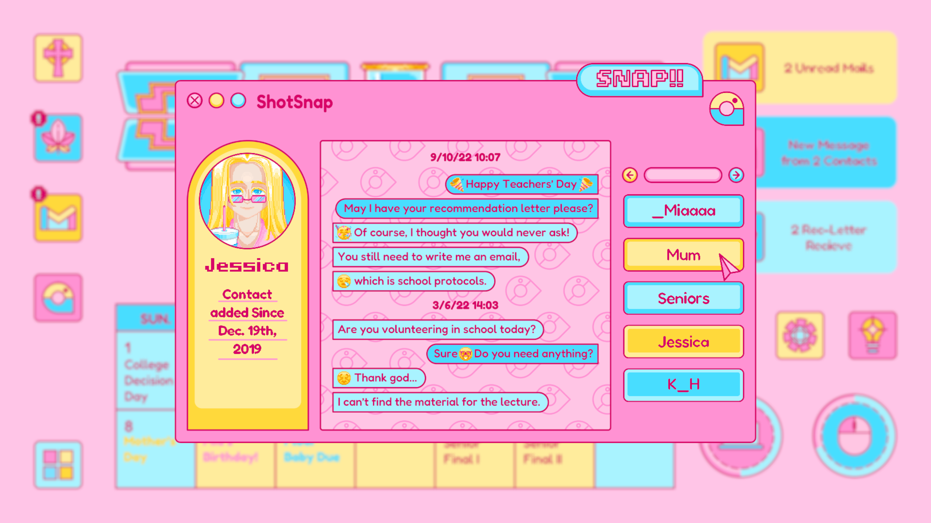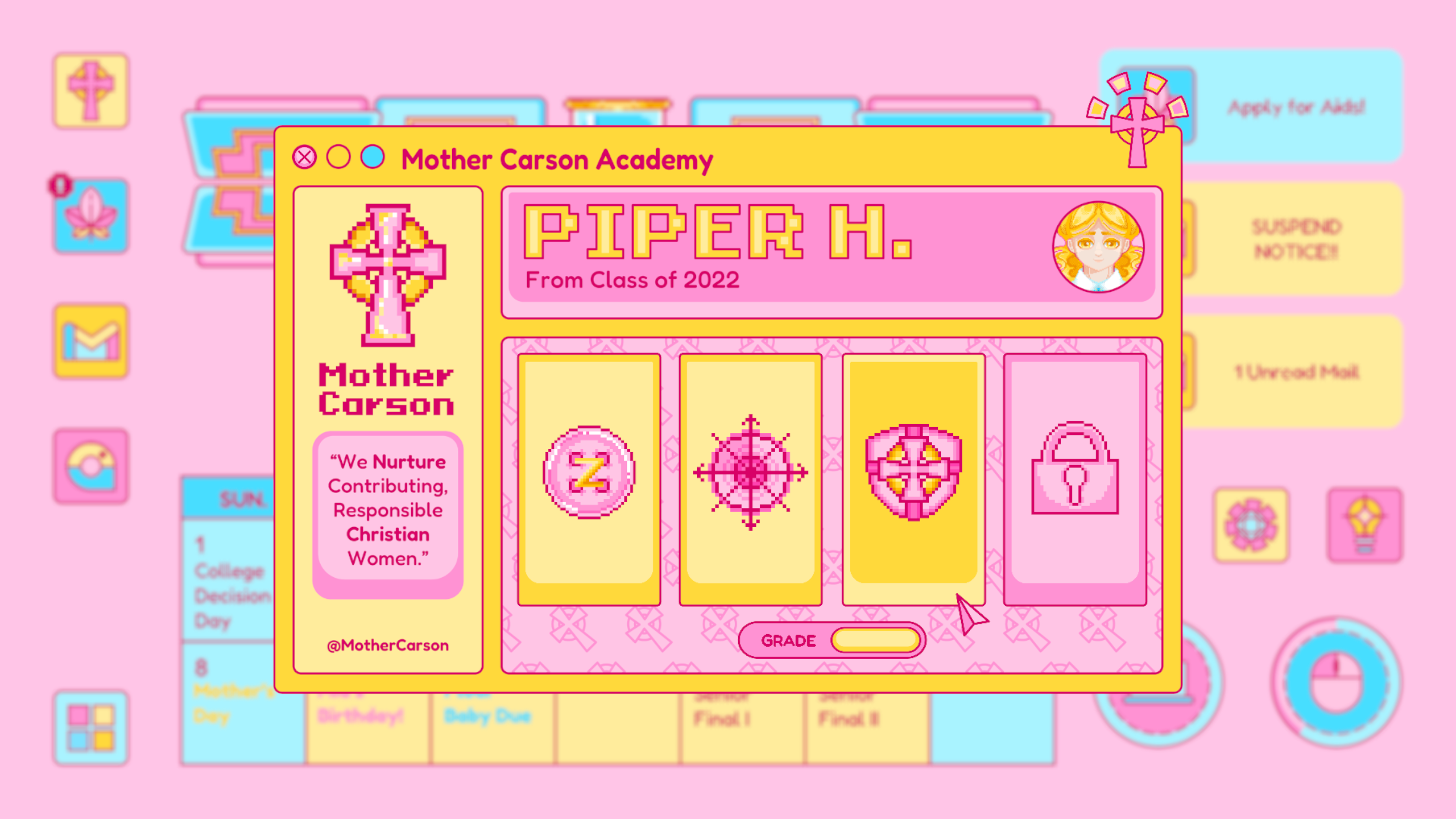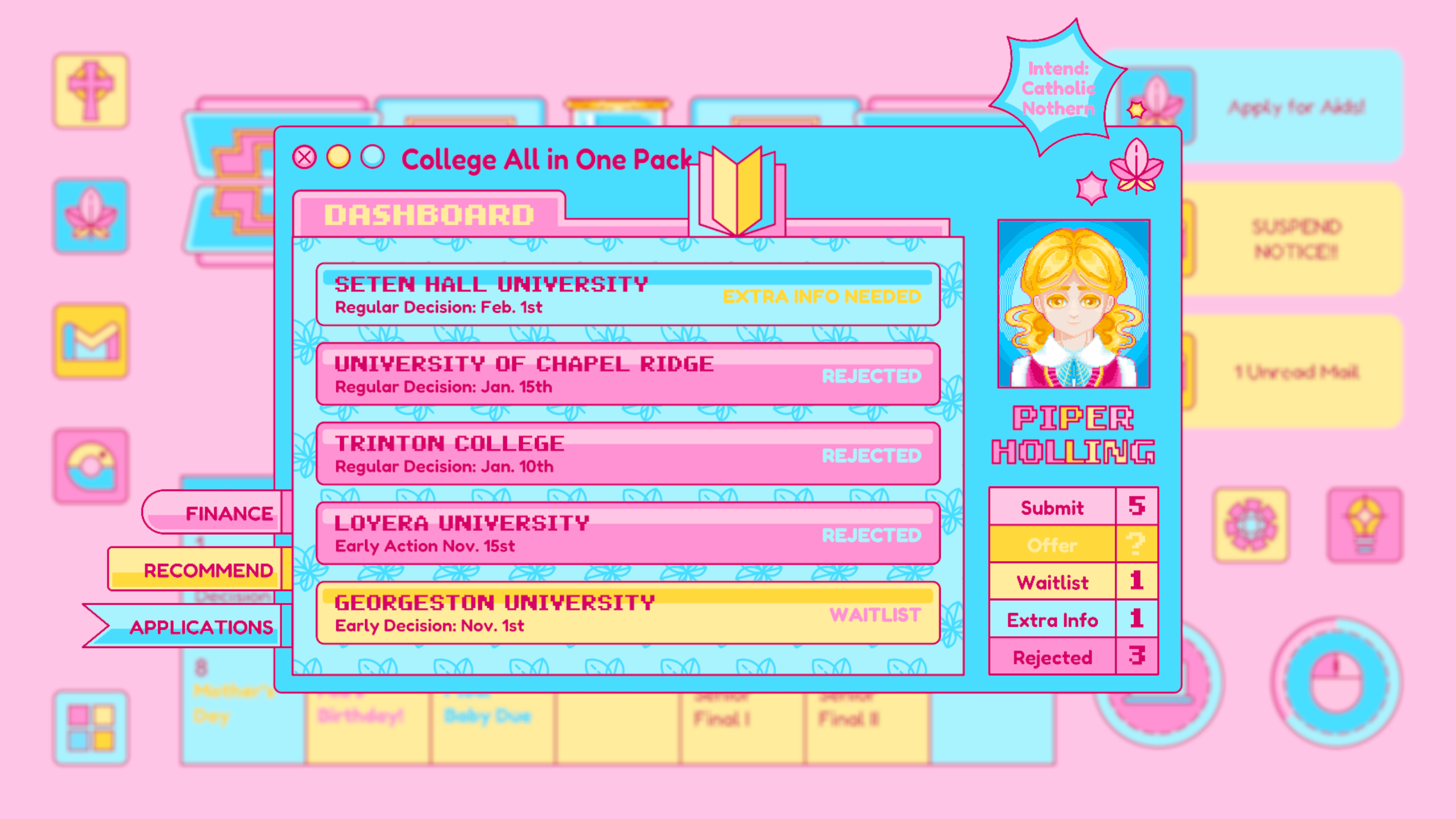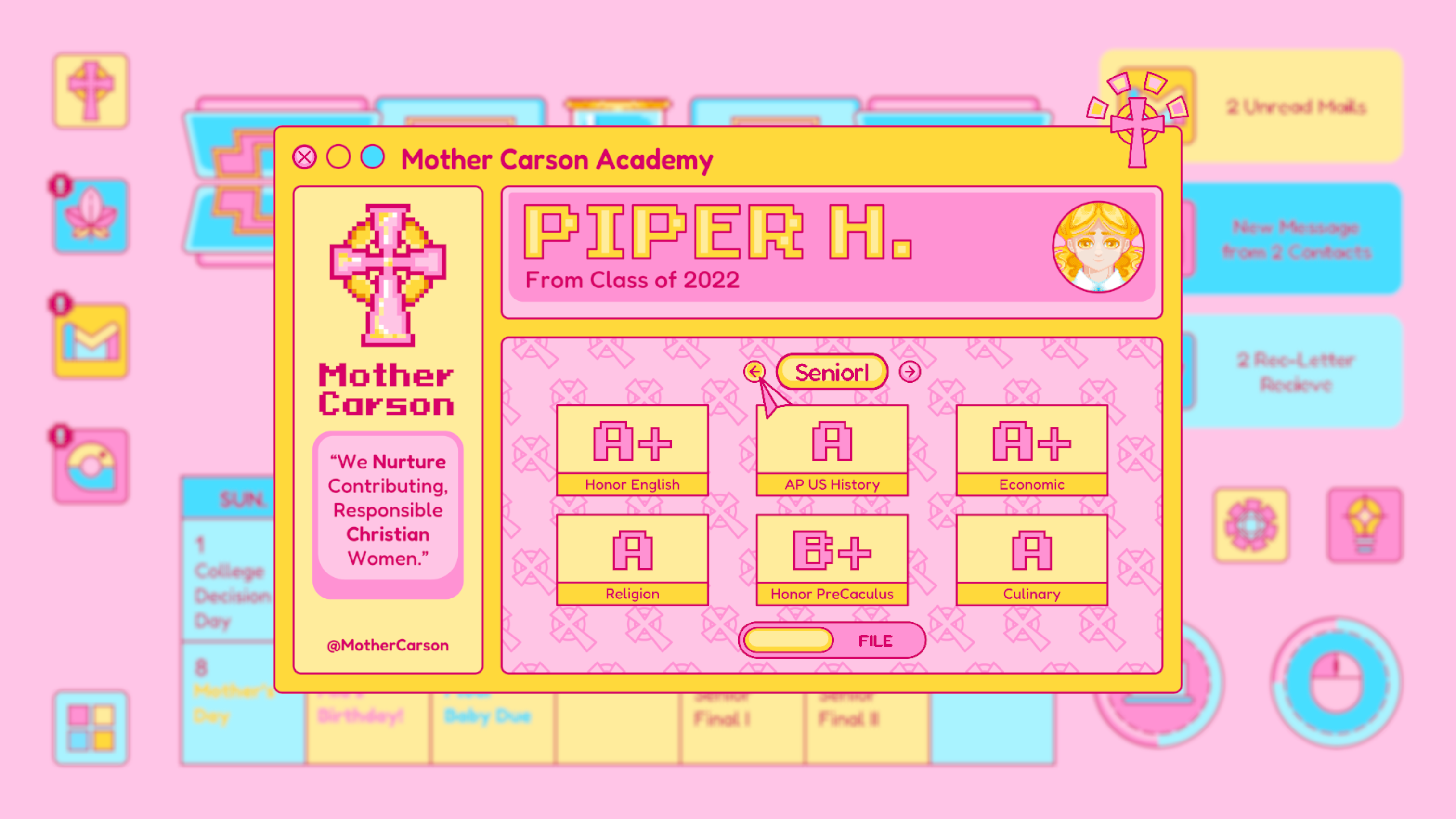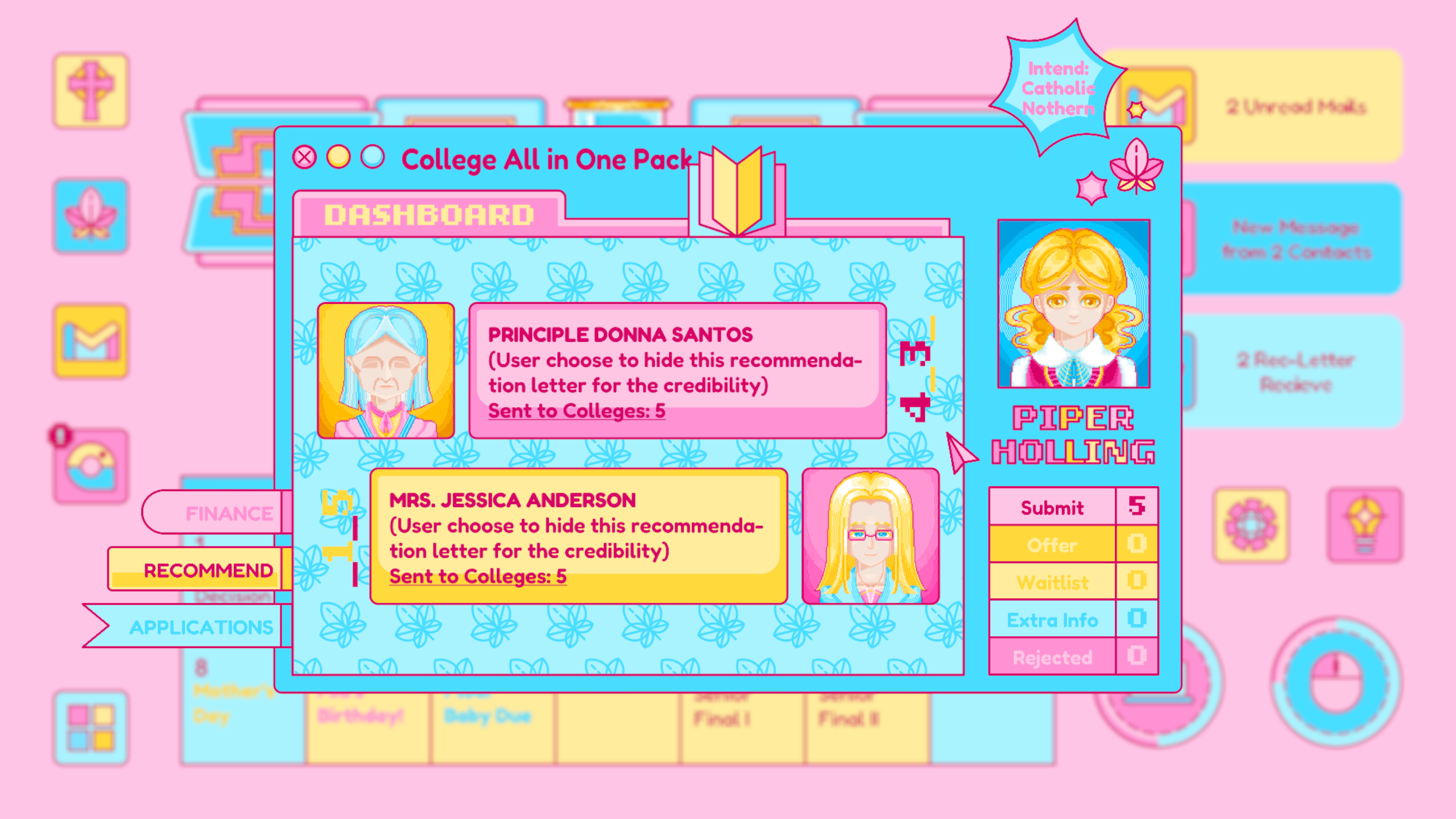 Mail is designed based on any real life email app, which is where Piper receives important and formal notice from colleges, schools, classes and instructors. The update of the mail usually signifies an important notice to change Piper’s current status. For example, the rejected letter from her dream school.