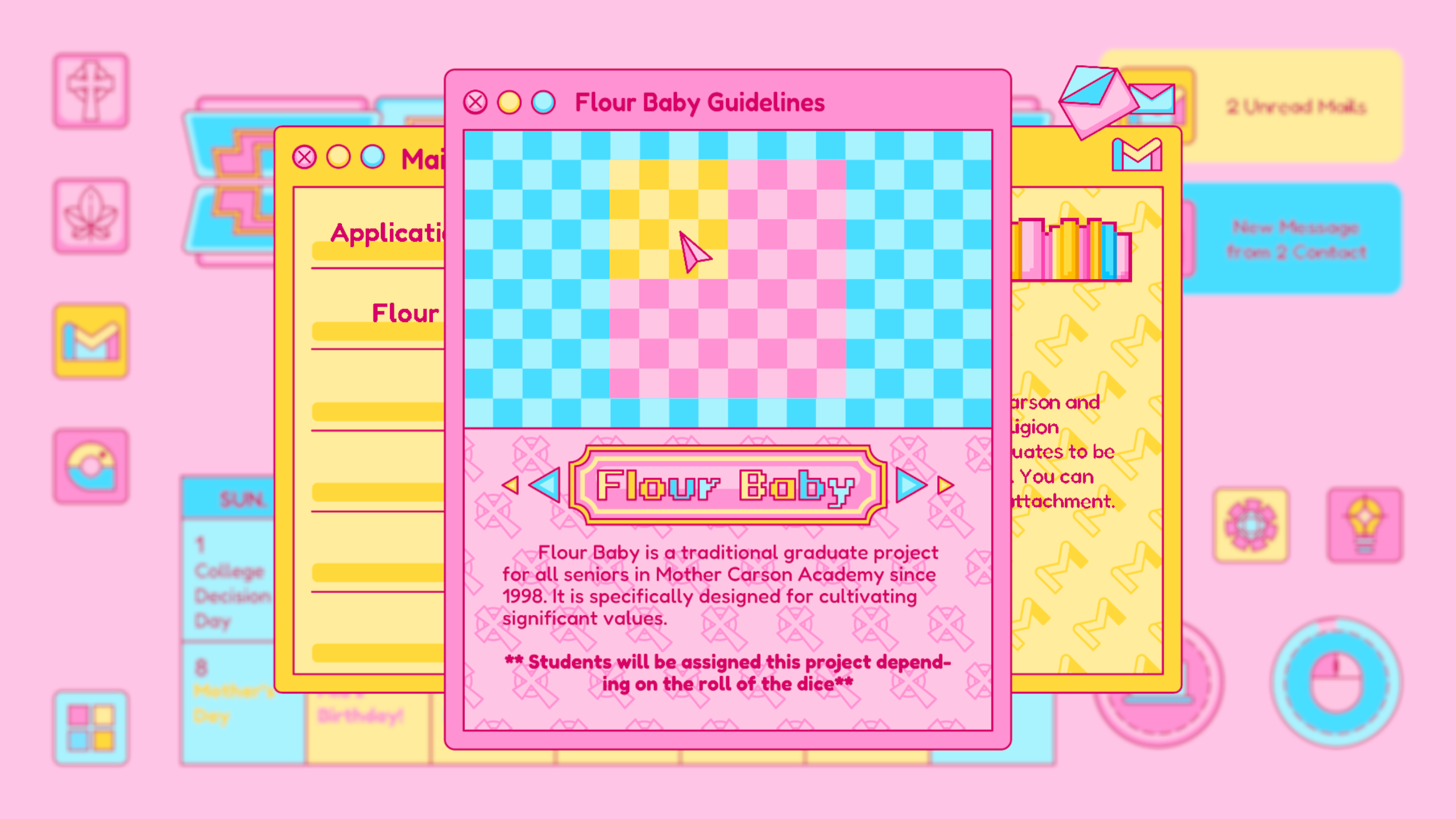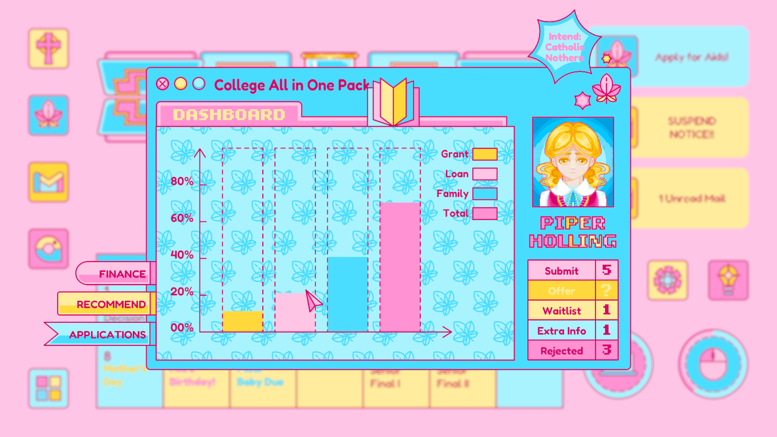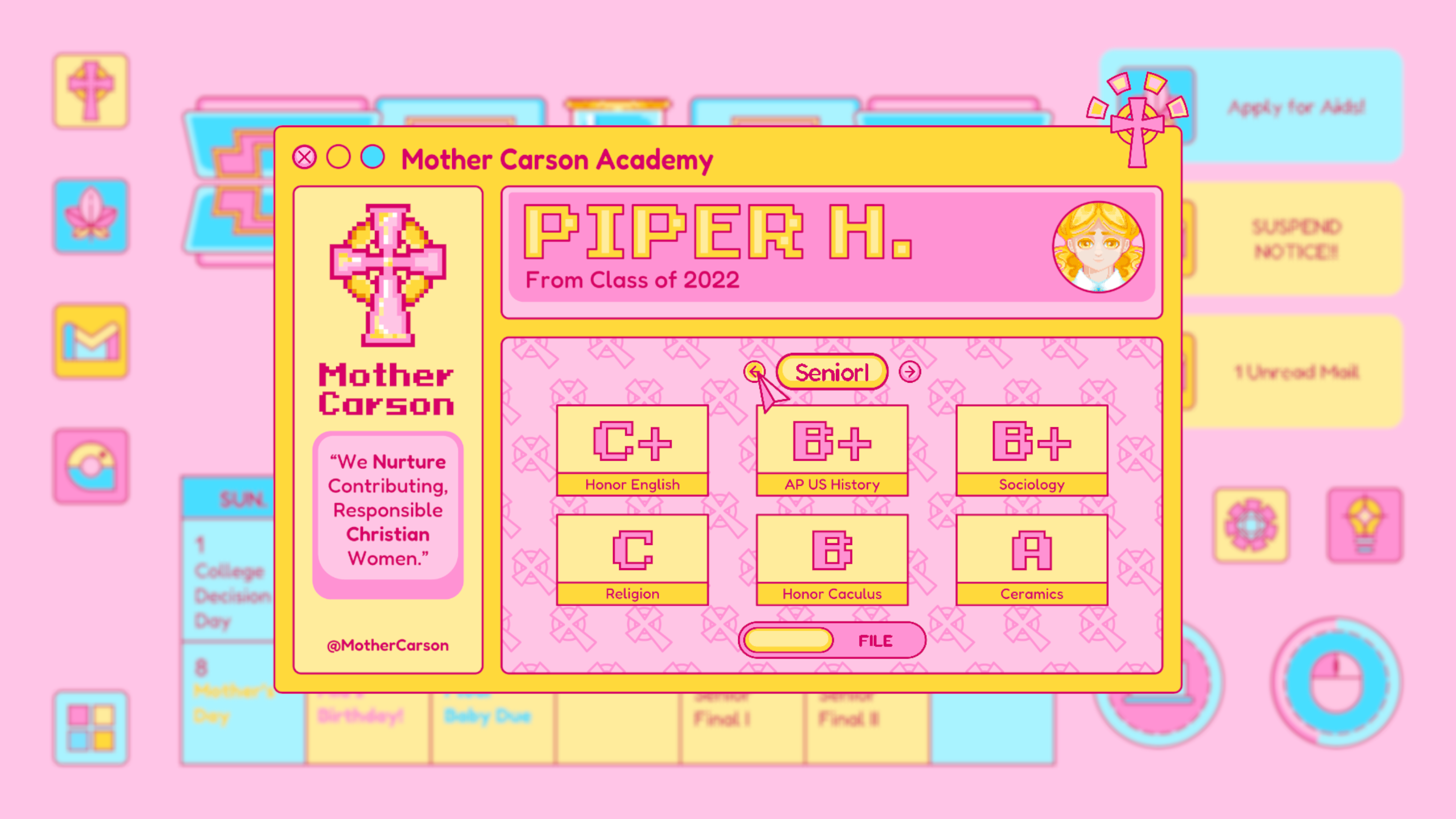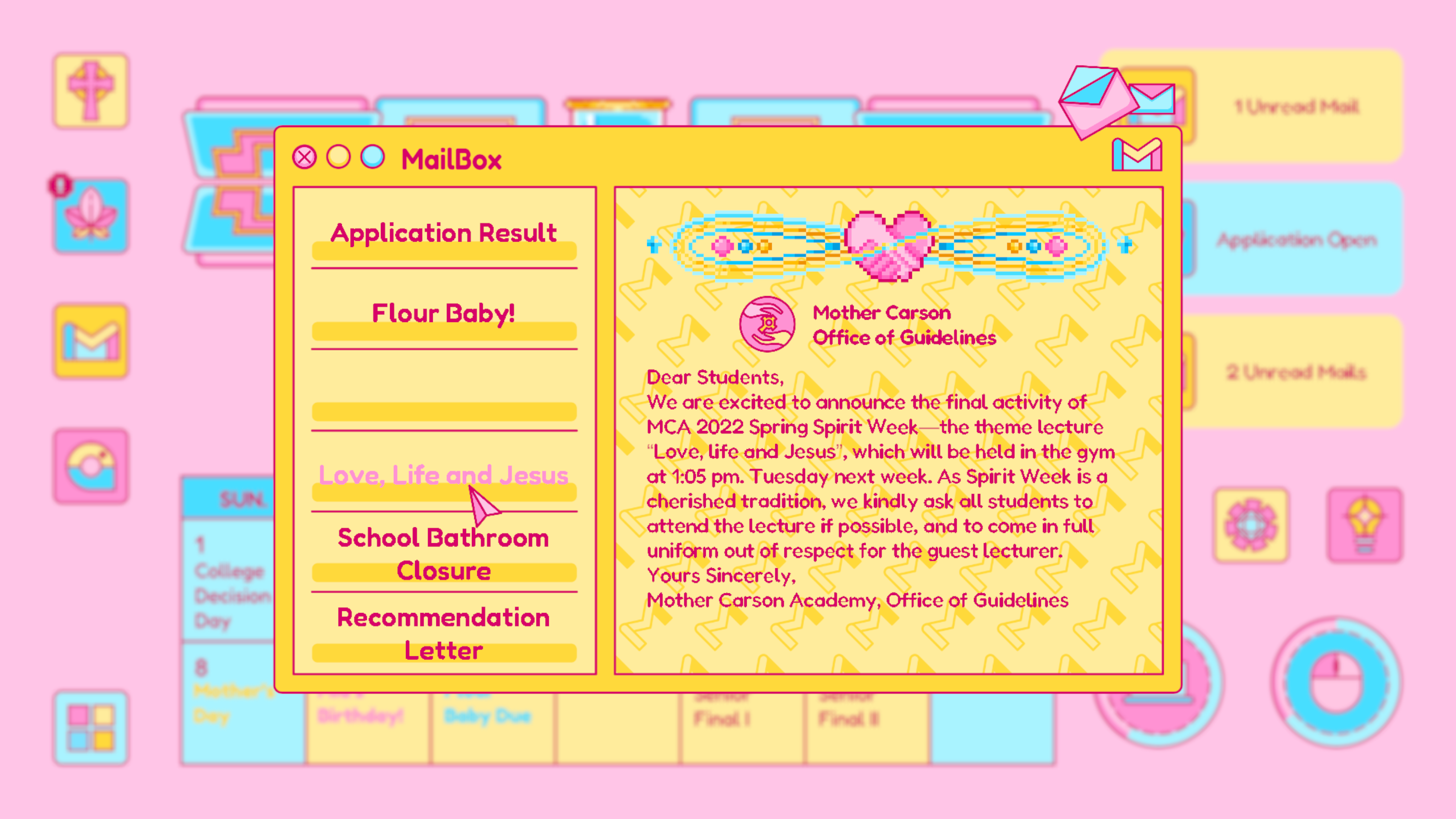 Mail is designed based on any real life email app, which is where Piper receives important and formal notice from colleges, schools, classes and instructors. The update of the mail usually signifies an important notice to change Piper’s current status. For example, the rejected letter from her dream school.