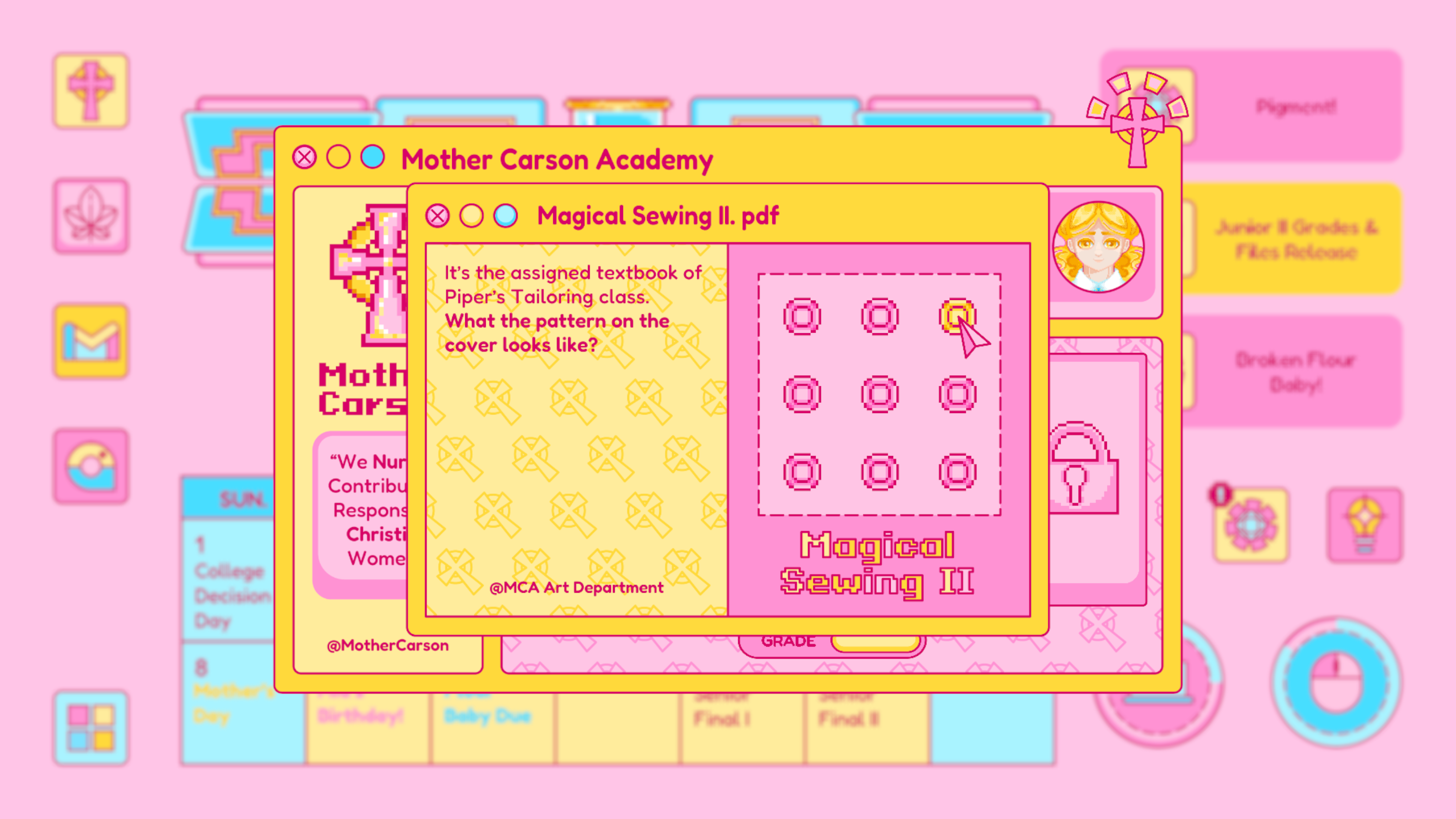 Flour Baby is the important memorial item in Piper’s Junior Year, signifying the friendship, relationship between Piper and her mother, and her reflection on some policy of her Catholic high school. In this part, Piper’s best friend Mia’s final project for the religion class, Flour Baby, was broken in a sleepover. The player is required to uncover the process of Piper helping Mia to fix the project by collecting memorial fragments listed below: Flour Baby Blueprints, Broken Flour Baby, Pigment in the right color and Needle & Thread.